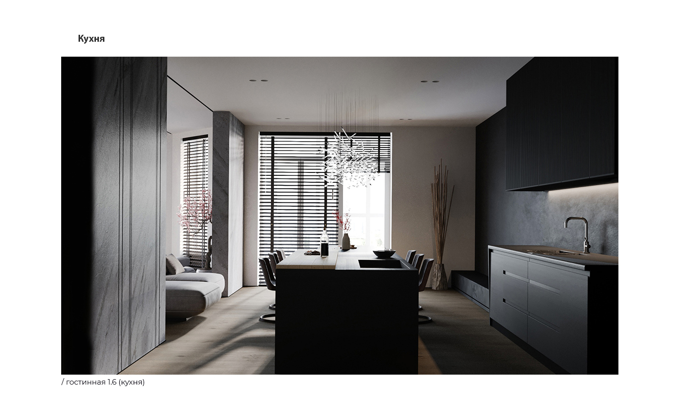 Кухня заслуживает отдельного внимания. Остров и обеденный стол являются продлением друг друга. Это решает сразу 3 задачи: 1 - Линейное размещение, позволяет максимально эффективно использовать площадь и форму помещения. 2 - Таким образом, увеличивается зона кухонной столешницы (острова), для прямого, повседневного использования. 3 - Однозначно, эстетика. Все таки, чем пространство лаконичнее и чище, тем оно совершеннее выглядит.